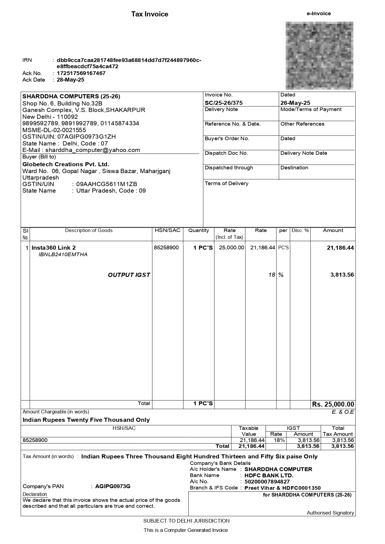 | 1 | INSTA360 LINK 2 INSTA | 85258900 | 21186.44 | GST INTEGRATED TAX (IGST) | 18.00 | 3813.56 | 18.00 | 3813.56 | |||